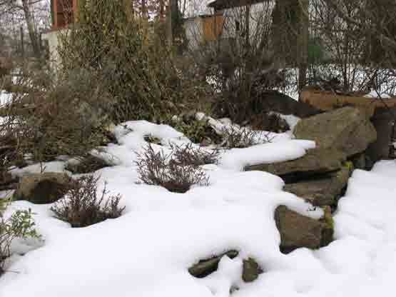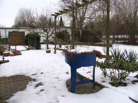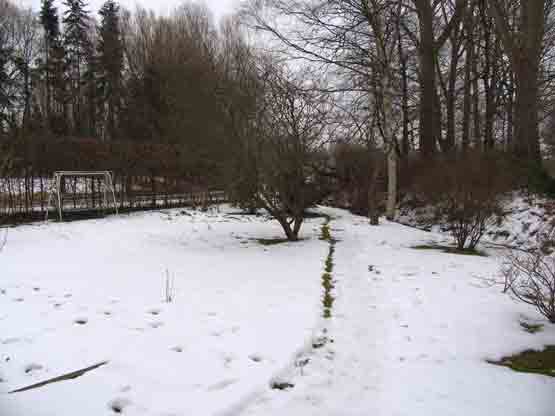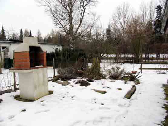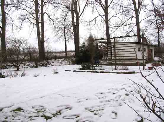 Ende März 2006 lag zur Besichtigung noch eine geschlossene Schneedecke. Wir wussten bereits, dass sich unter ihr nur wenig befand. Doch der interessante Grundriss, die starke Beschattung durch umstehende Bäume und die Randlage mit angrenzendem Graben ließen uns nicht lange zögern, den Kleingarten zu übernehmen. Die bislang geringe gärtnerische Nutzung versprach viel Gestaltungsspielraum. Erfreulicherweise sind einige Ziergehölze aus der Zeit der Gründung der Kleingartenanlage um 1975 erhalten geblieben.