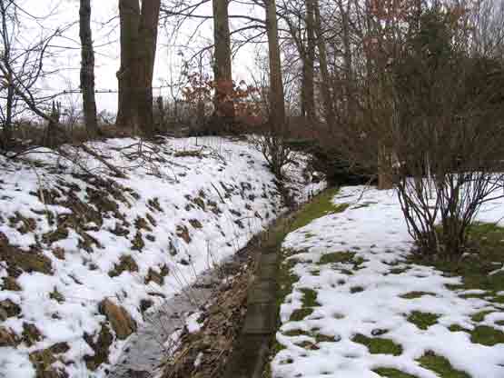 Hinter der Laube ist der Graben verrohrt. Es ist noch nicht abzusehen, dass hier Probleme liegen. Durch den starken Laubeintrag wird der Graben jährlich ca. 5 cm flacher. Das Rohr liegt jetzt unter dem Wasserspiegel und neigt zum Verstopfen. An der Böschung wachsen hier Haselnussbüsche.
