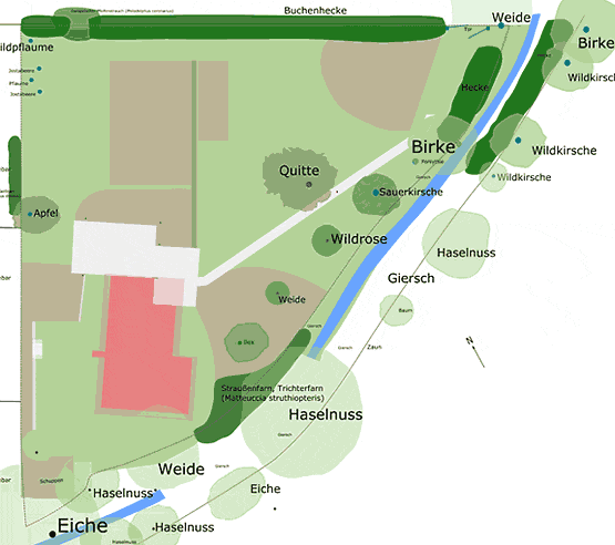 und eine Eiche. Der Garten liegt nahezu vollständig bis 17.00 Uhr im Schatten.