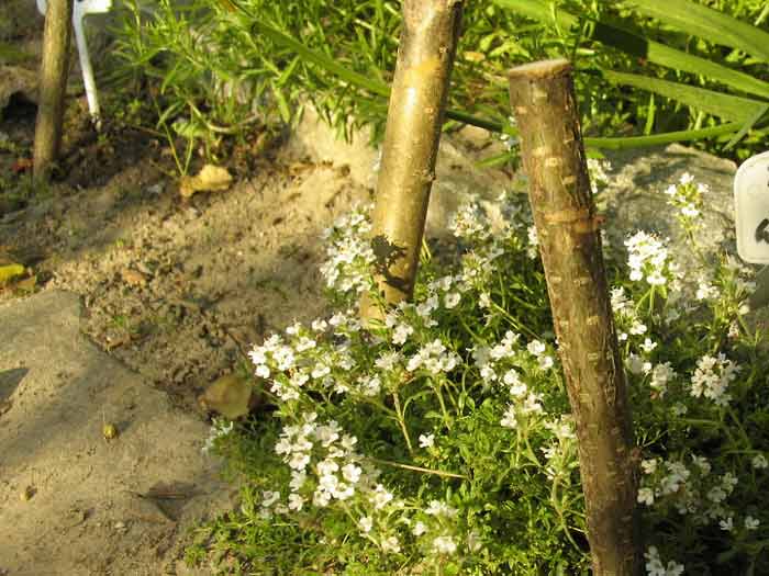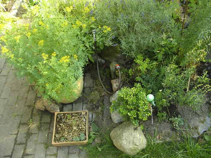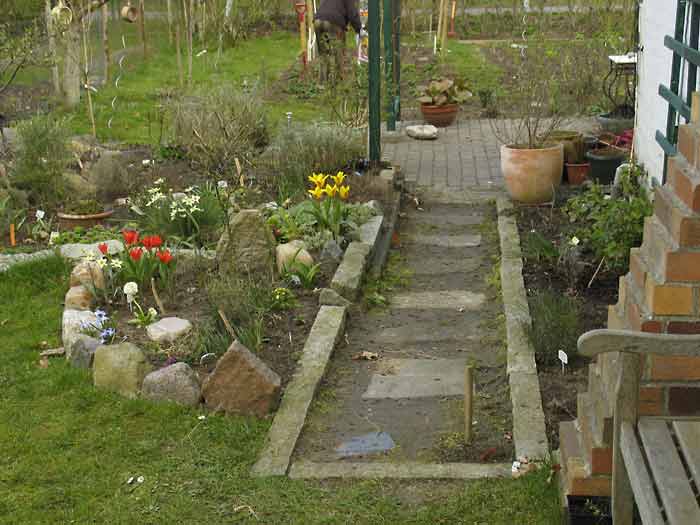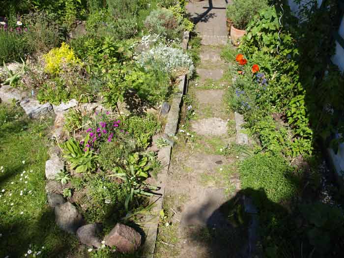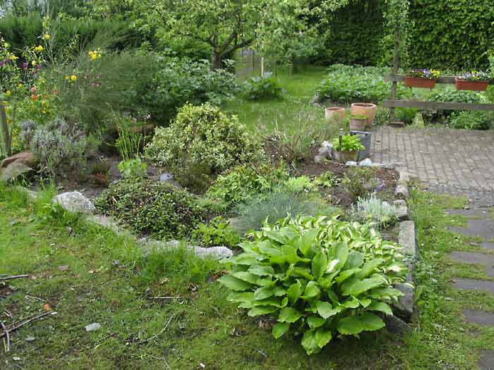 Das Kräuterbeet wurde rechts längs des Weges erweitert und mit verschiedenfarbigen Steinen eingefasst.