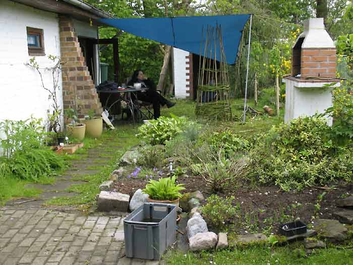 Garten in Umgestaltung, das Kräuterbeet und der Weg an der Laube