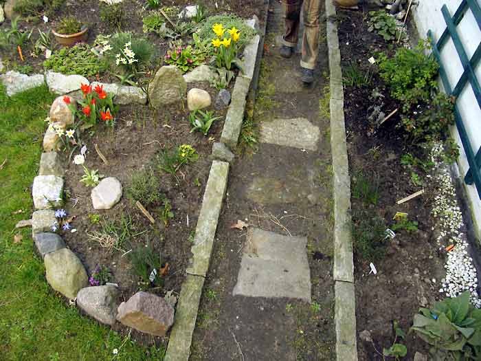 Die Betonplatten wurden aufgenommen. Als Wegeinfassung wurden preisgünstige Granitsteine gewählt.
