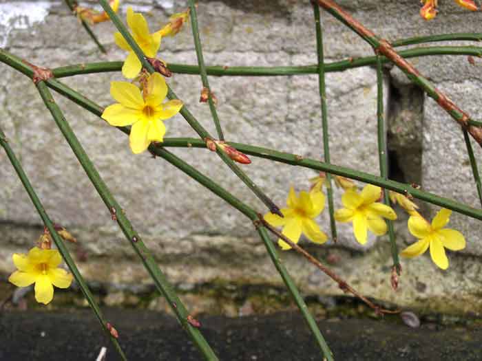 Schon im zeitigen März blüht an der Hauswand ein neugepflanzter Winterjasmin.