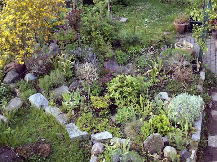 Blick vom Dach der Gartenlaube auf das Kräuterbeet Ende Mai 2010.