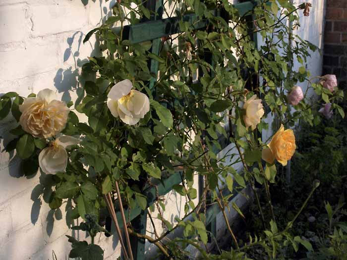 Die Rosen am Rankgerüst an der Hauswand blühend.